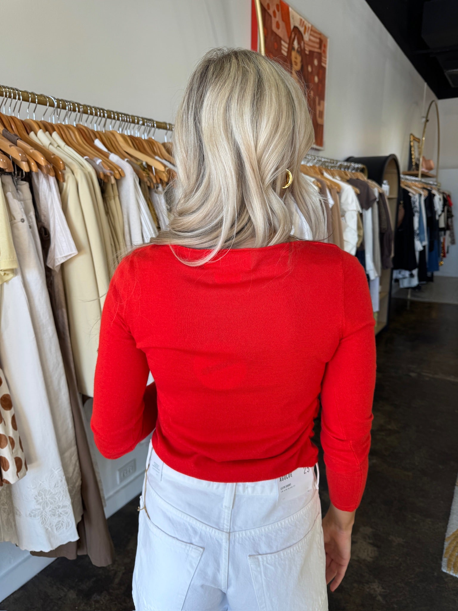 Woman wearing a white cropped sweater and light-colored pants indoors.