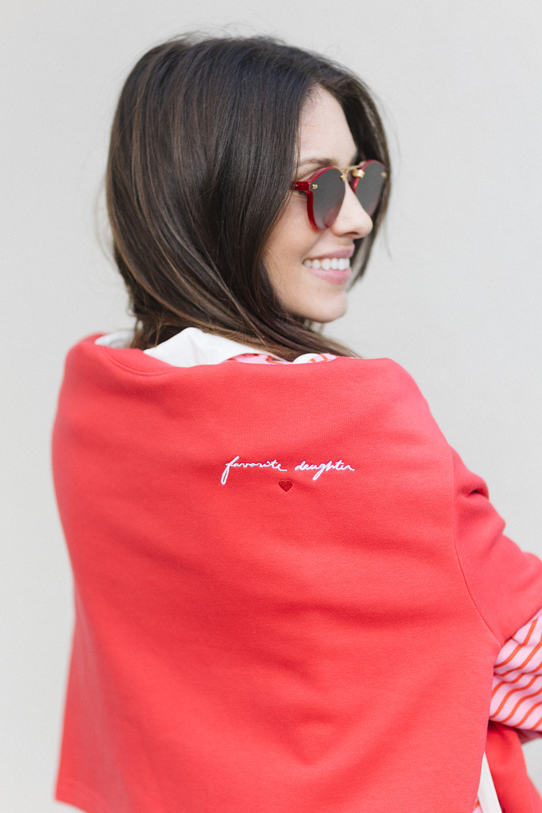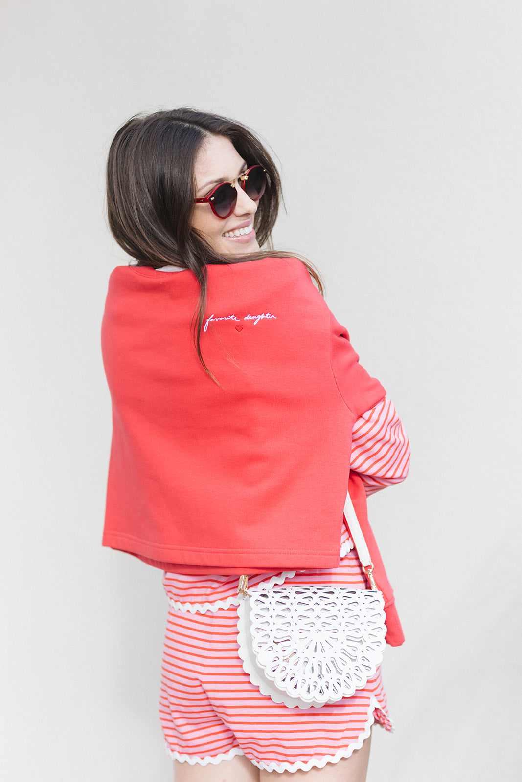 Woman wearing a tan sweater with black palm tree design and black shorts, standing by a pool.