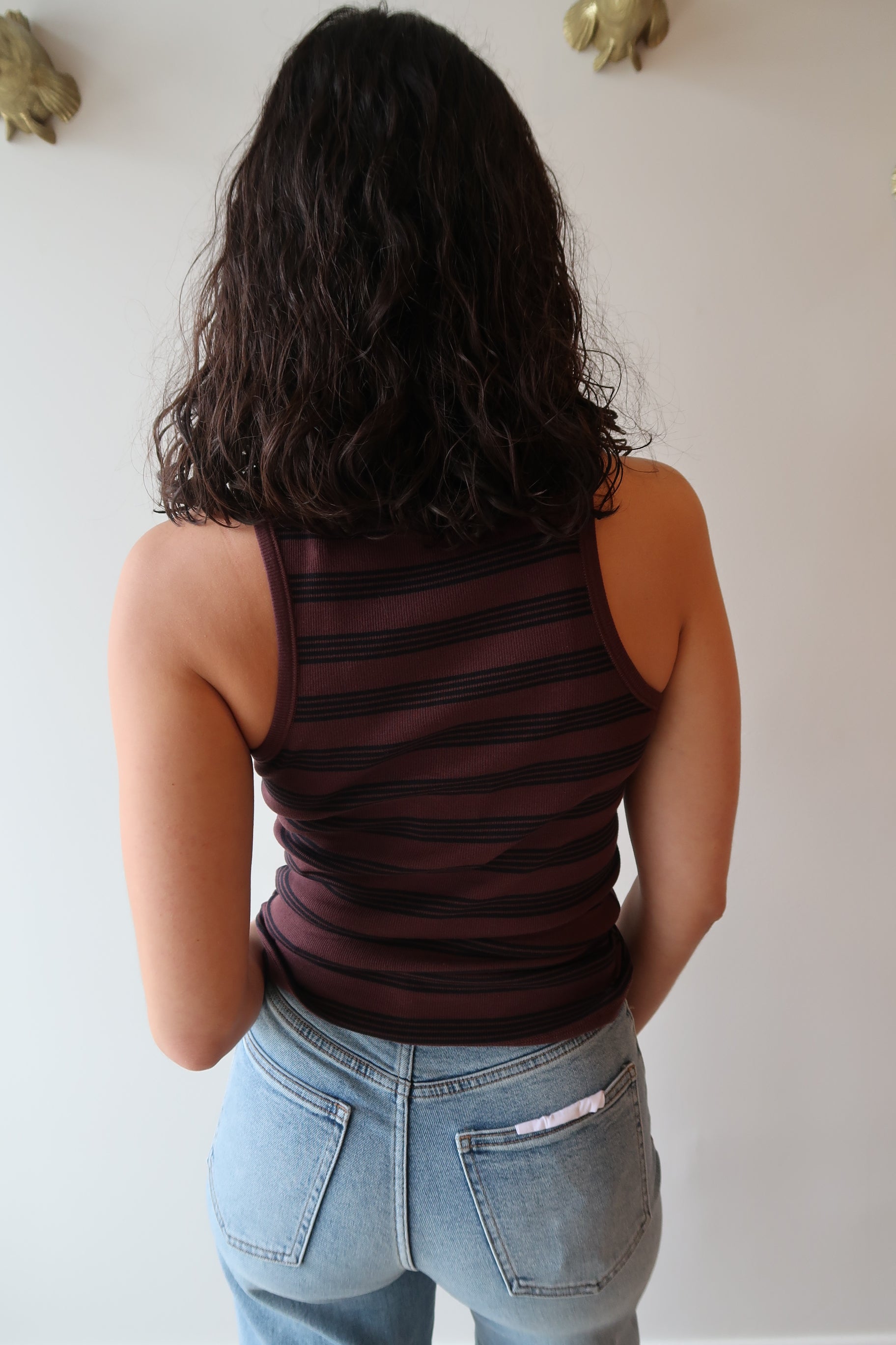 Woman wearing a blue vest over a beige shirt in a bedroom setting
