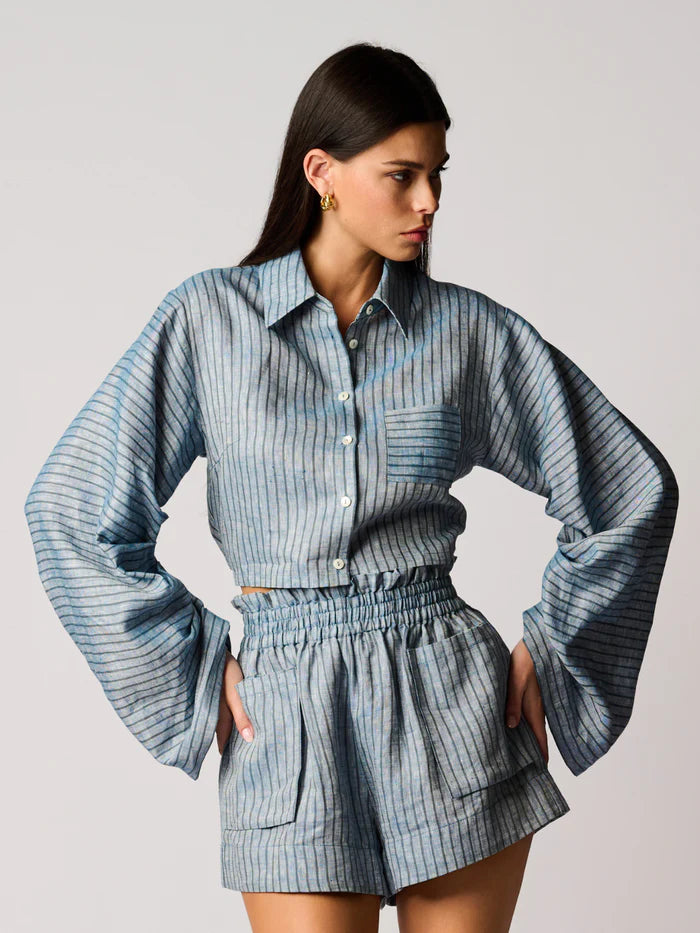Woman wearing a light blue sweater with sheer sleeves against a white background