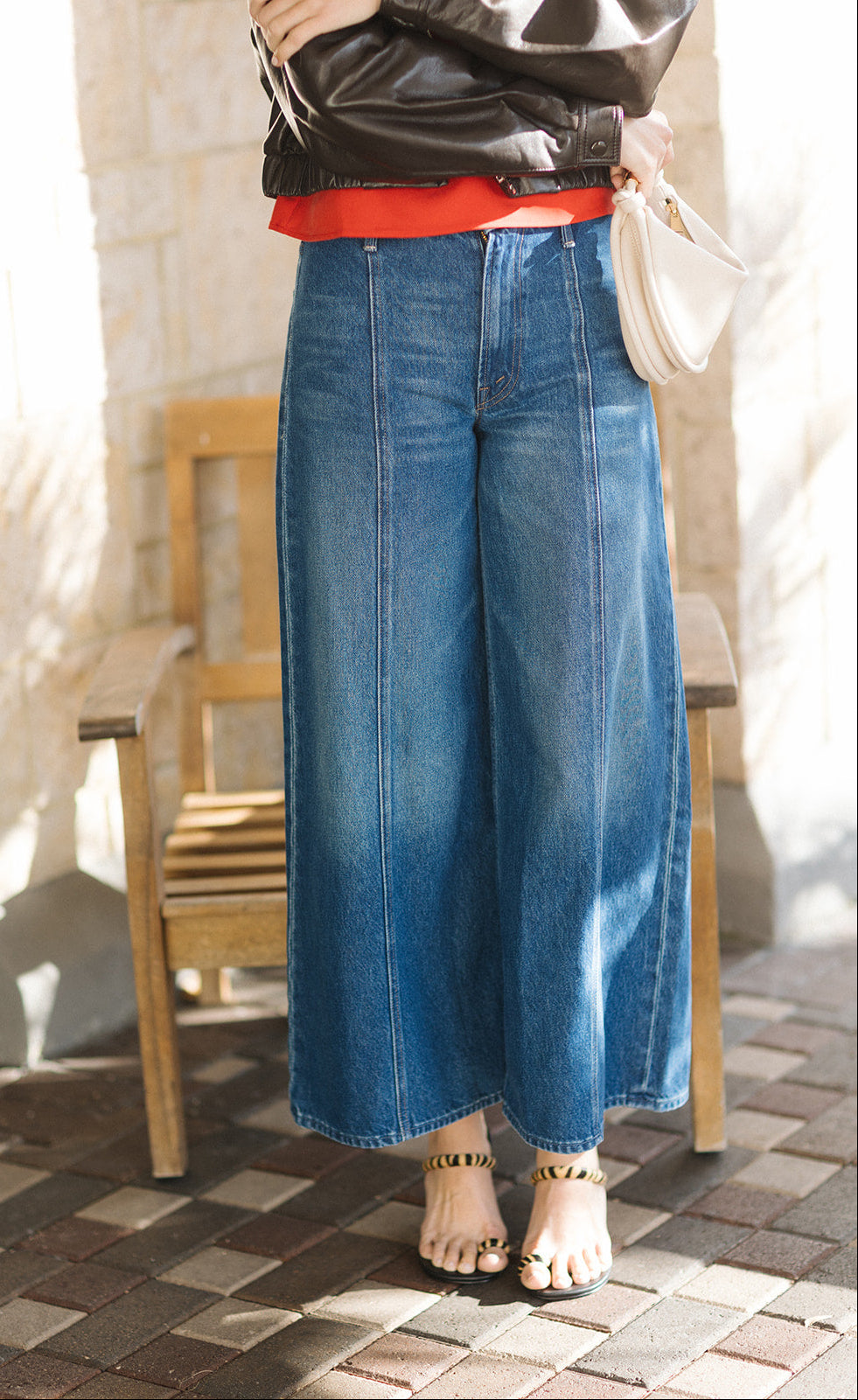 Person wearing a white long-sleeve top and black wide-leg jeans on a light blue background