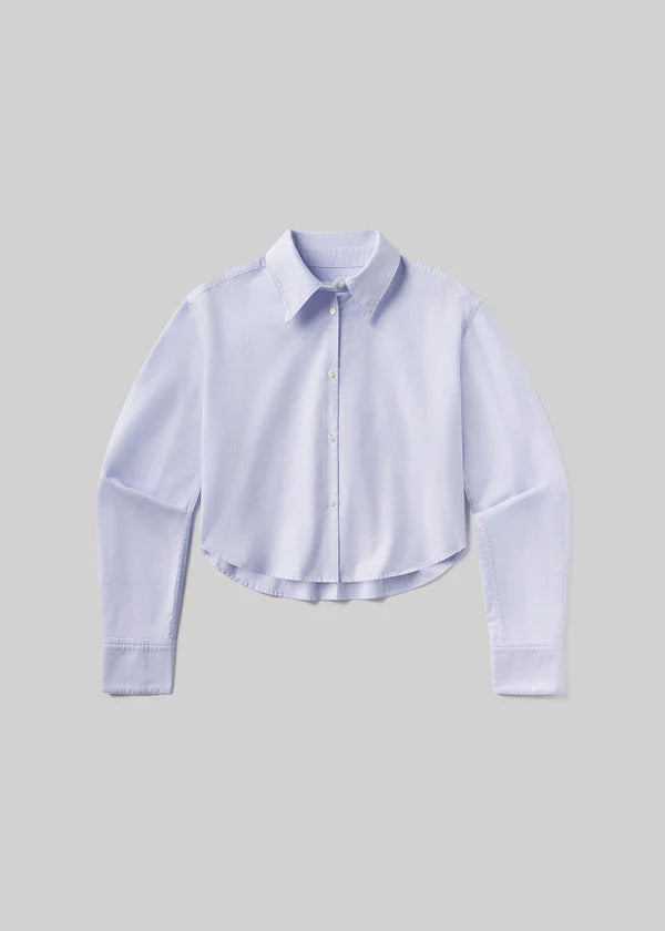 Person wearing a light blue button-up shirt and blue jeans on a plain background