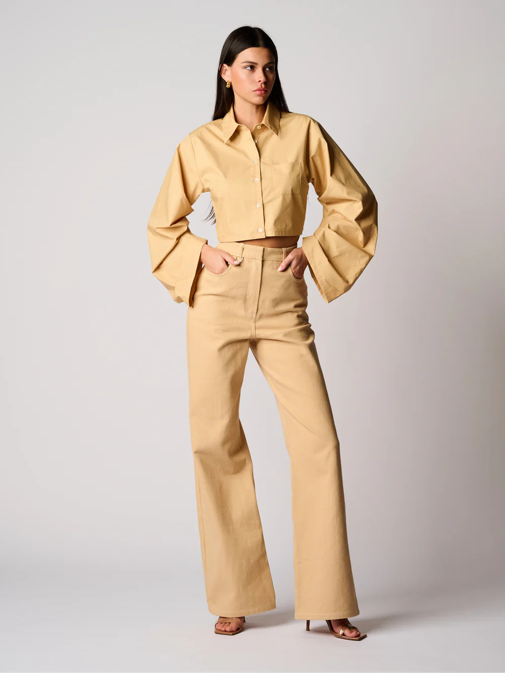 Woman wearing a light yellow blouse and light blue jeans on a white background