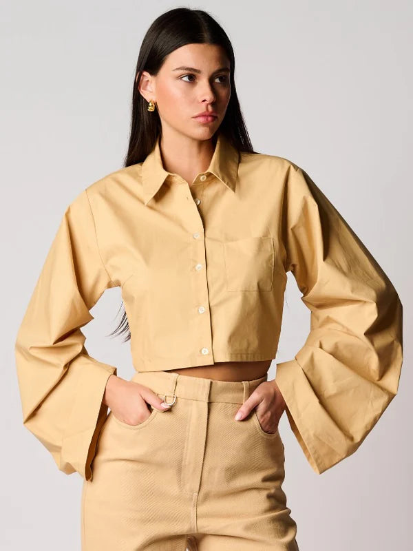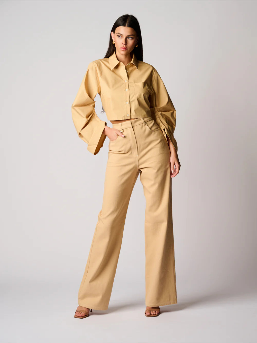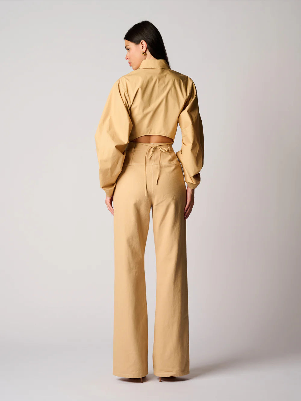 Satin Bubble String Top and Satin Pleat Pant full body side view