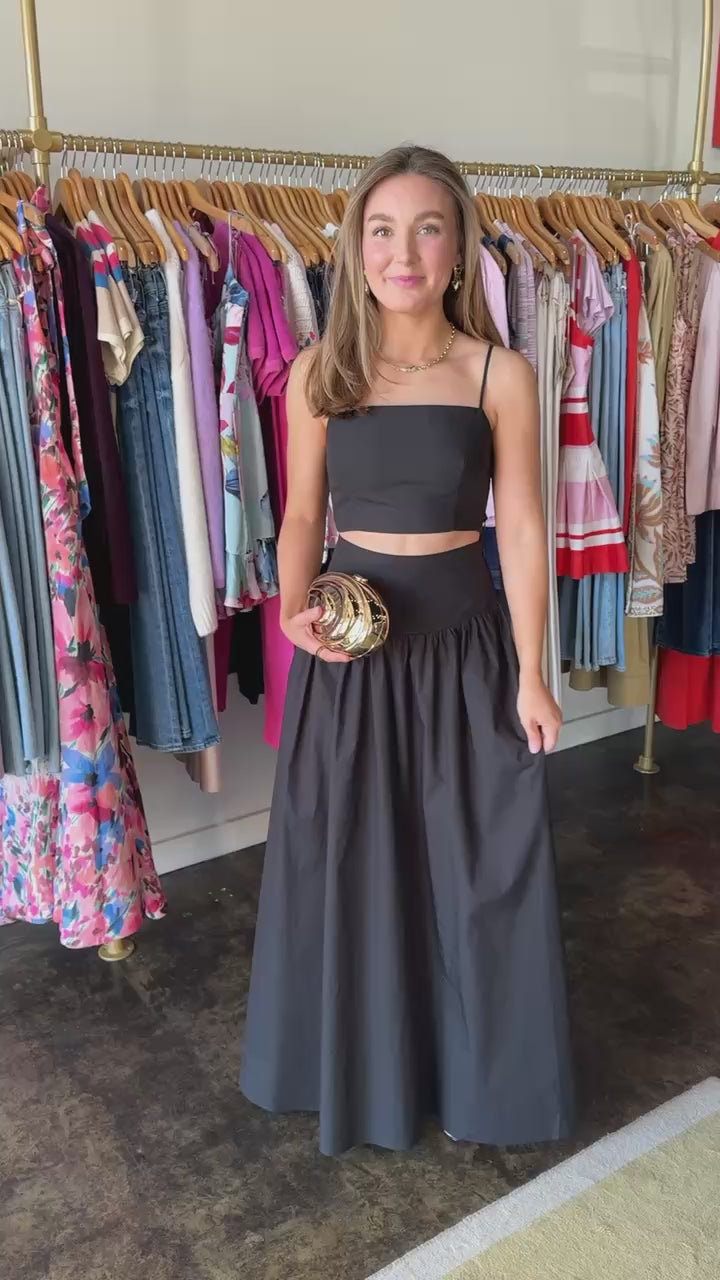 Woman wearing a black two-piece outfit on a white background