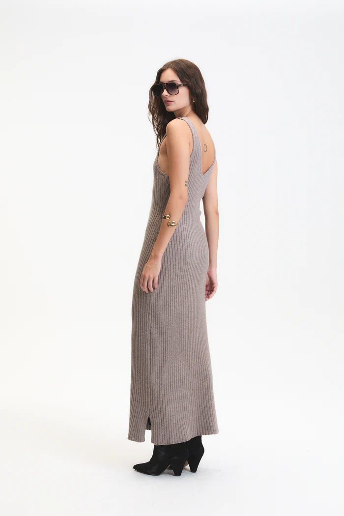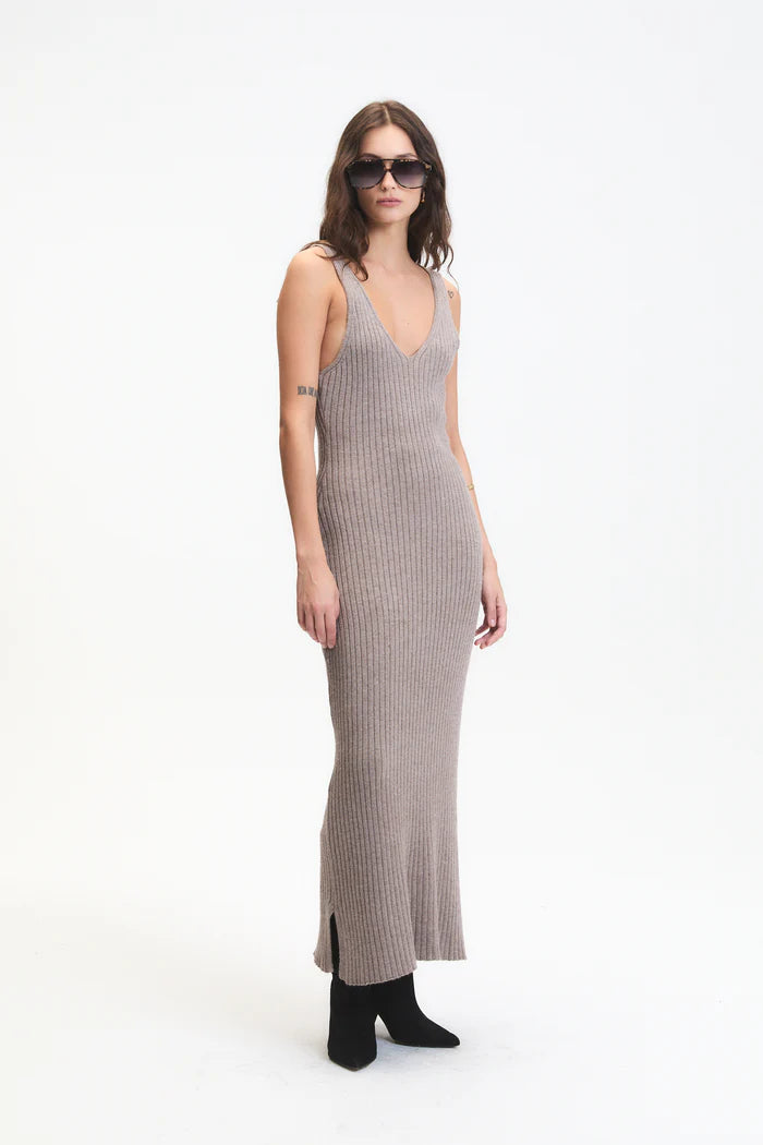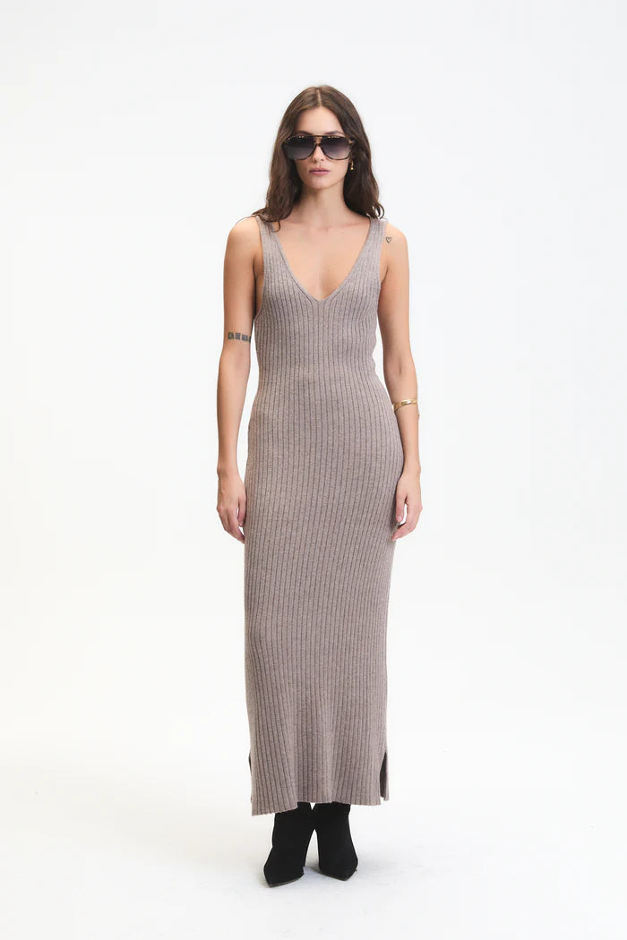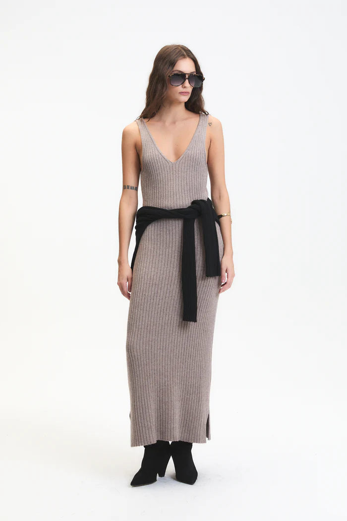 Woman wearing a beige sleeveless top and brown skirt on a white background