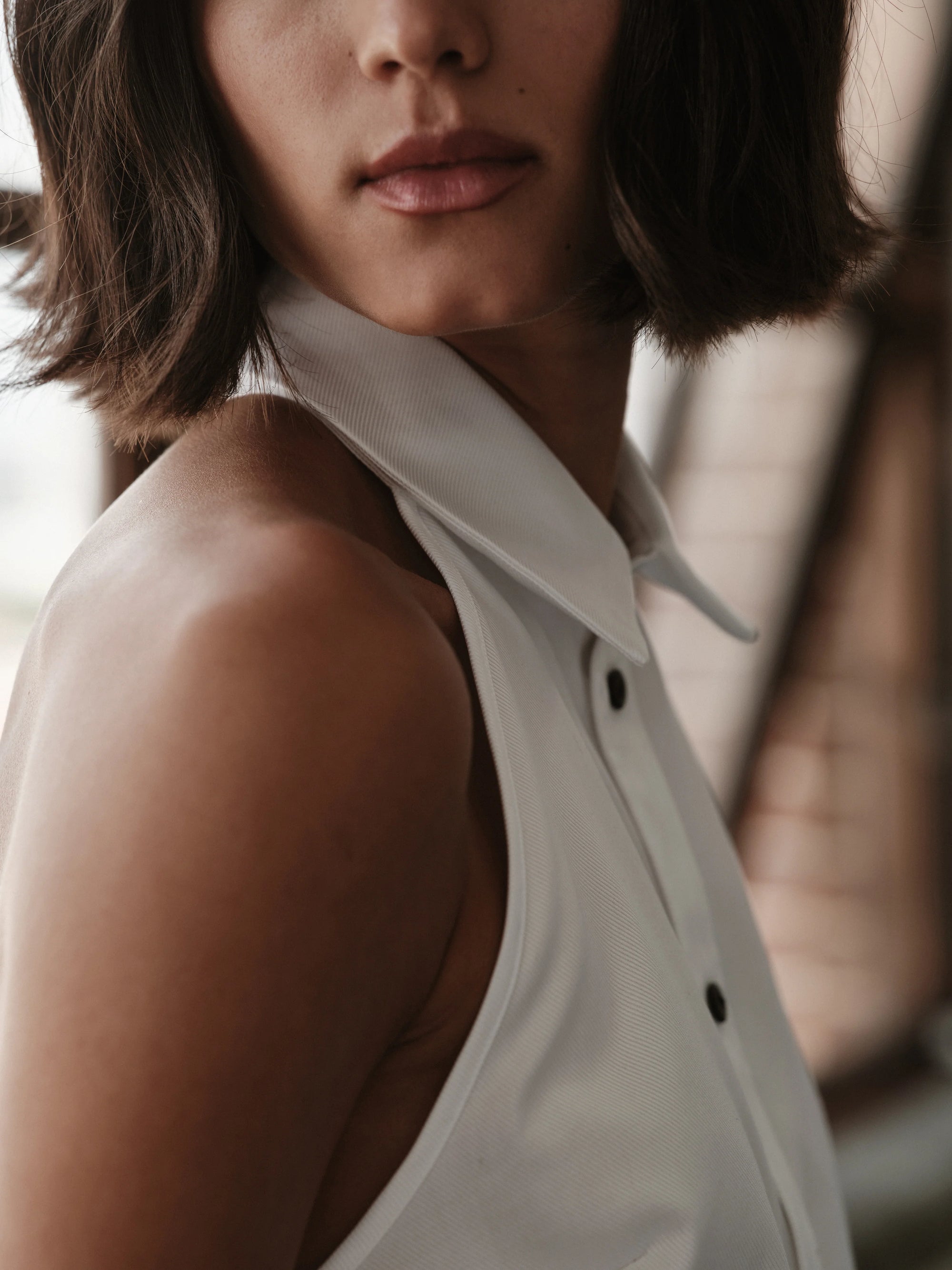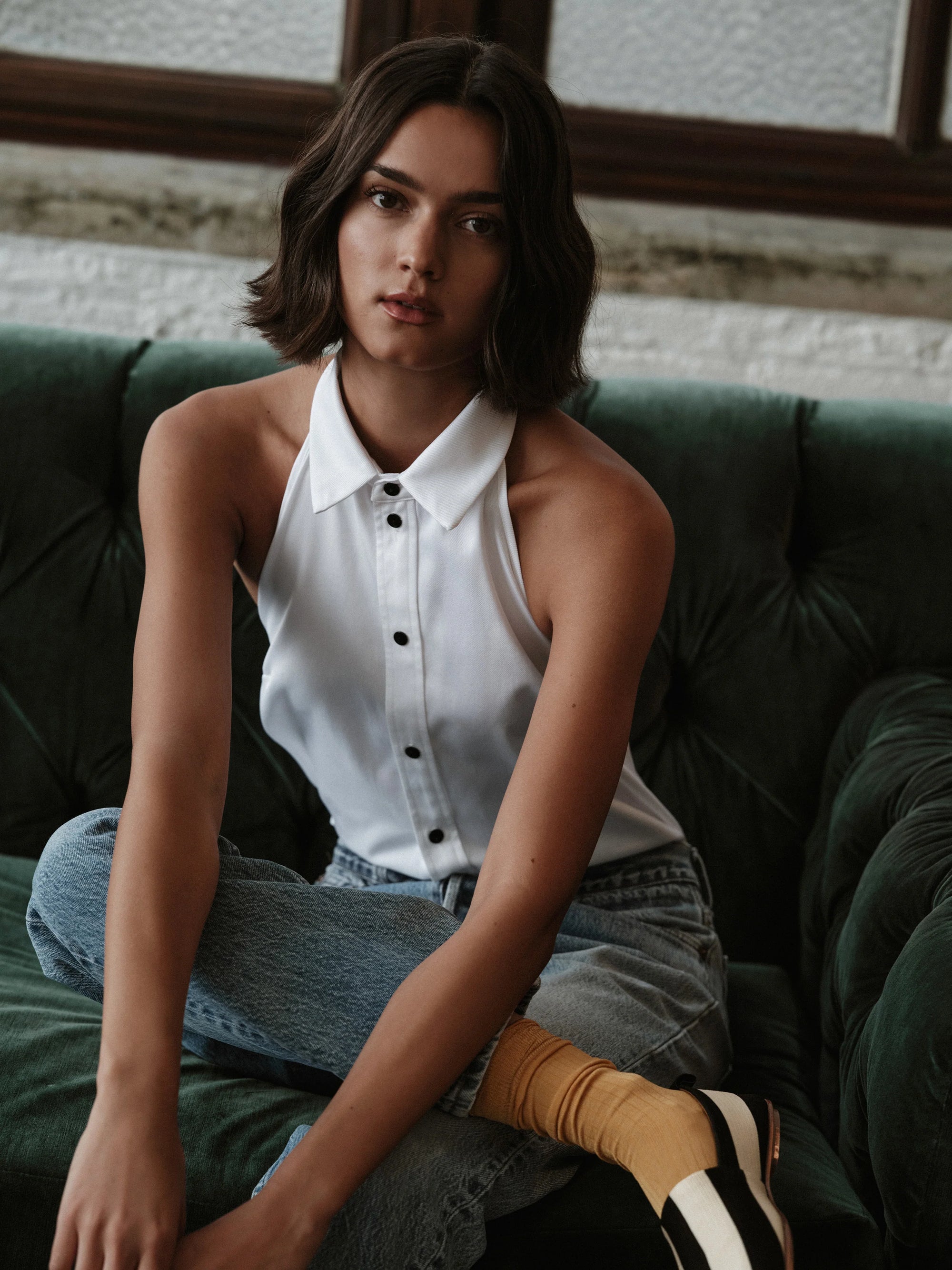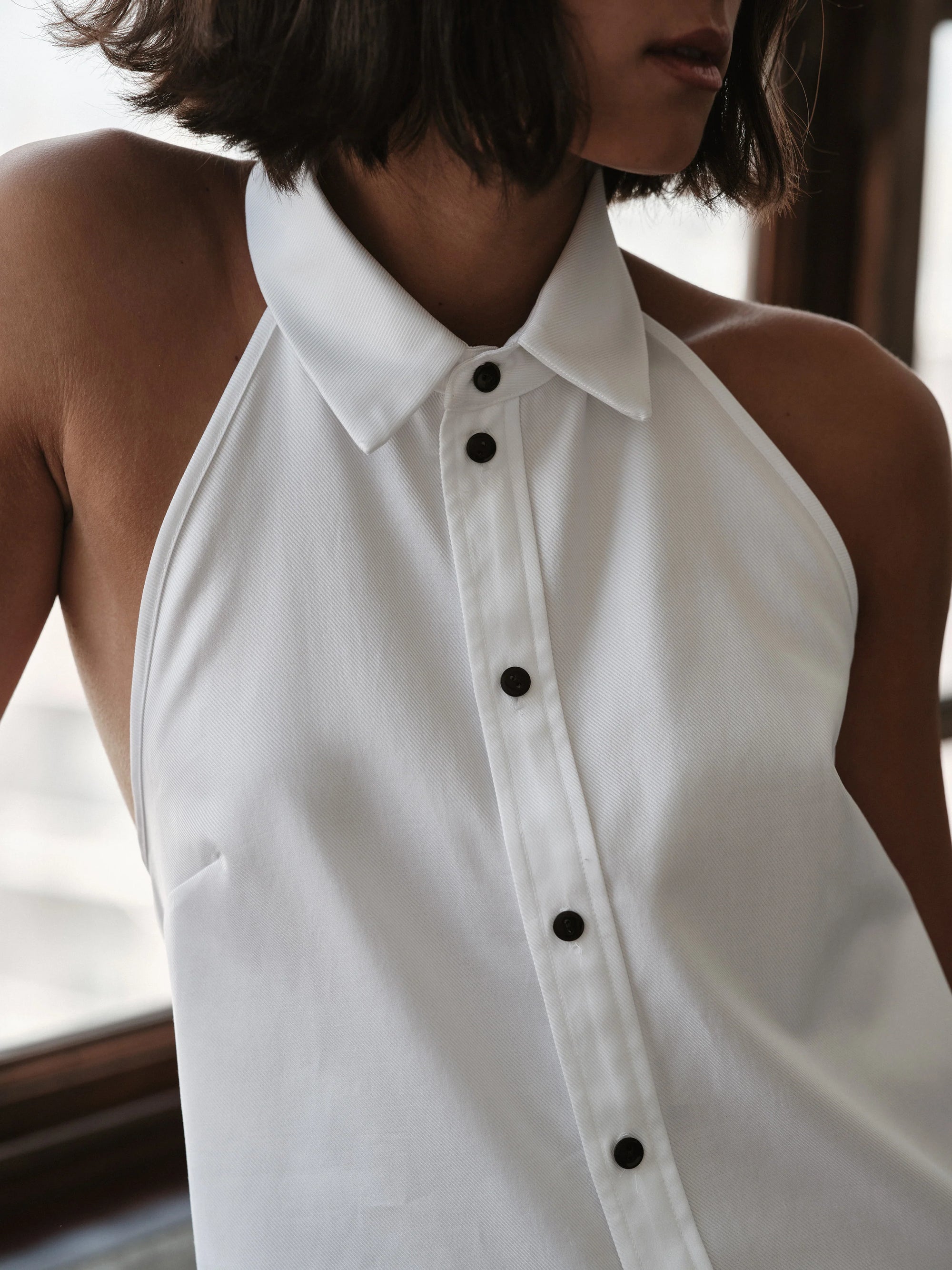 Woman wearing a black halter neck top with buttons and blue jeans indoors.