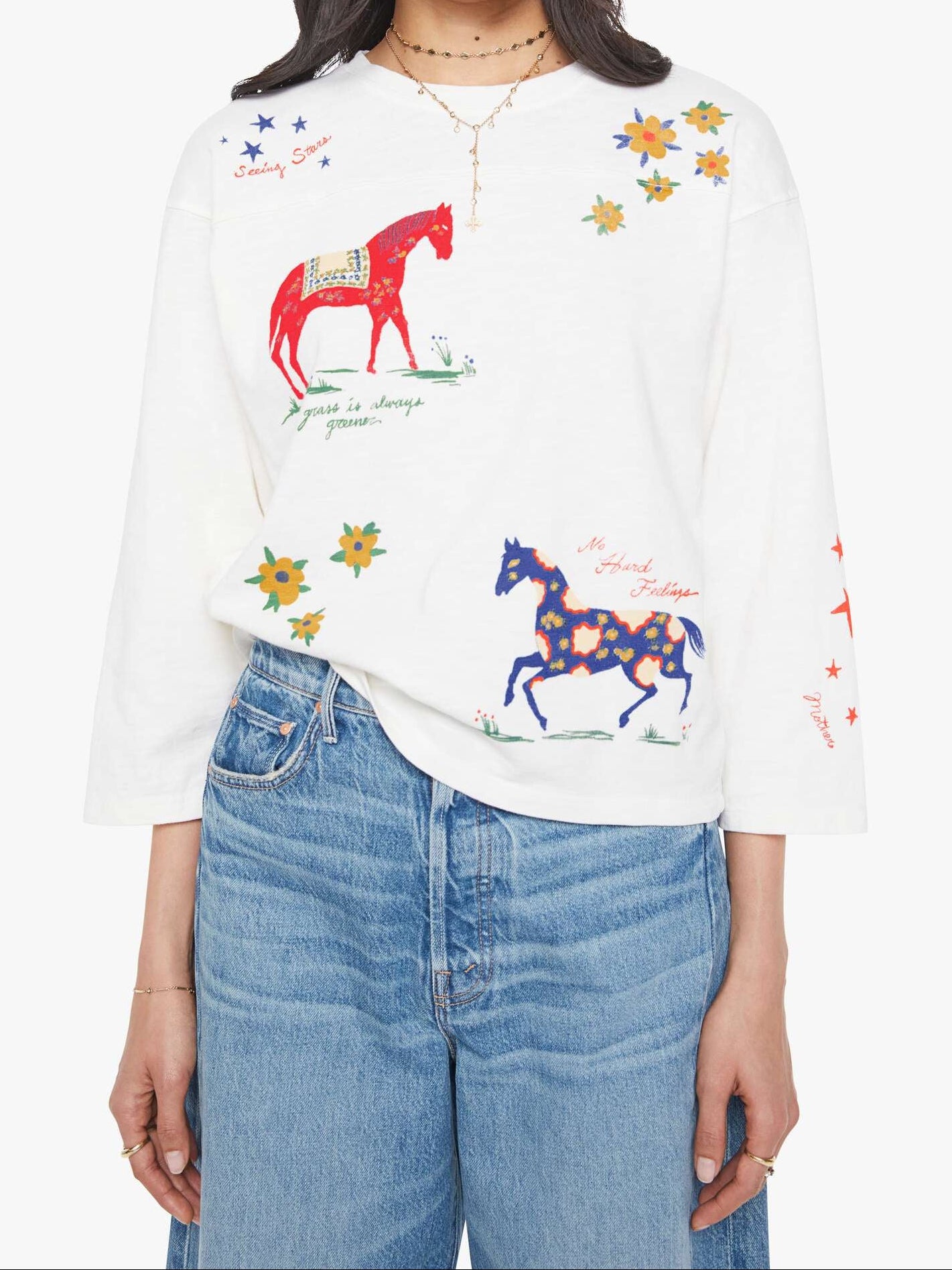 Person wearing a white t-shirt with horse graphic and 'Stable Relationship' text, standing against a colorful abstract background.