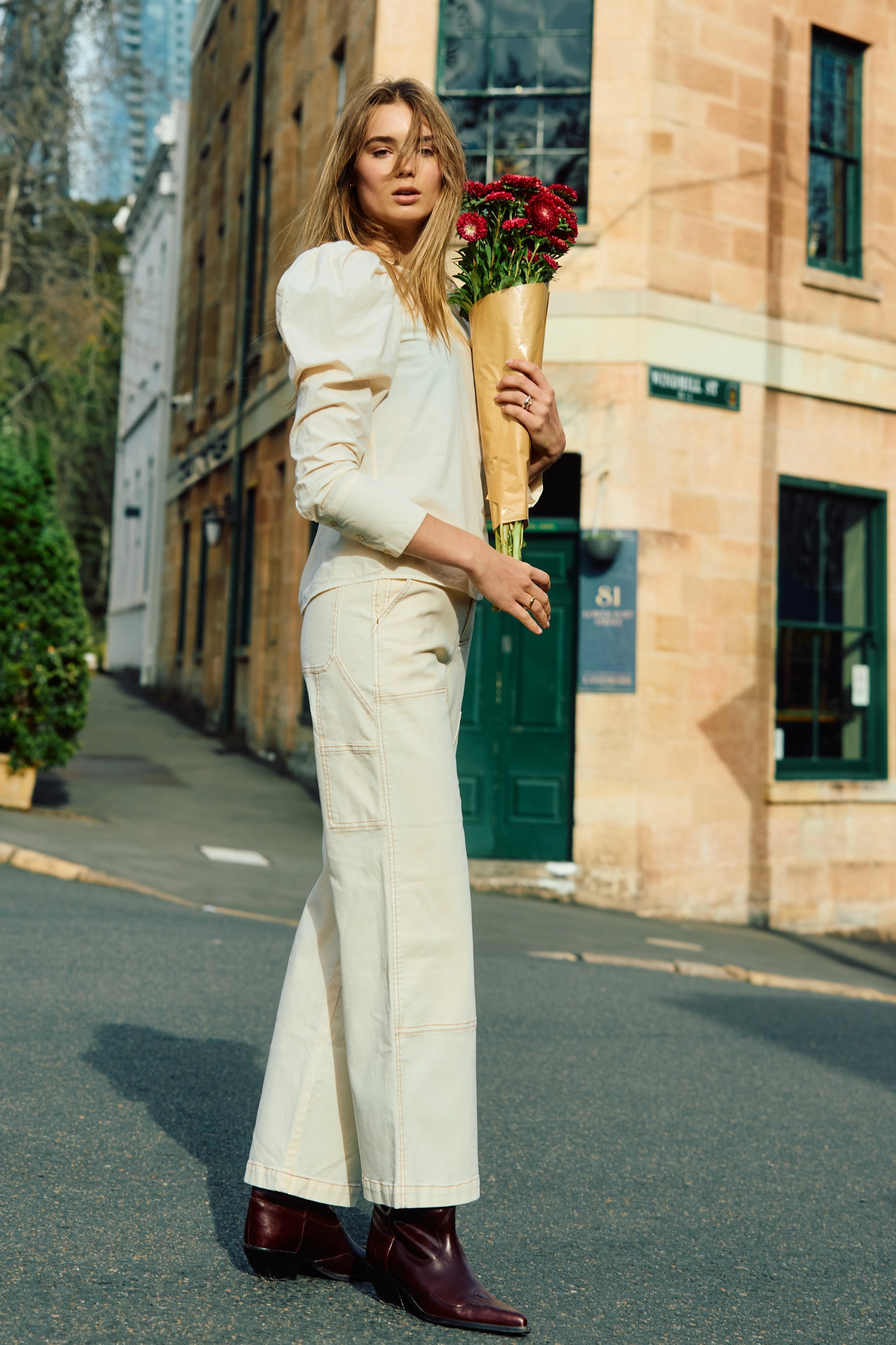 Woman walking outdoors with a cream handbag, wearing Anna Cropped Shirt Plaid and Miro Jean.
