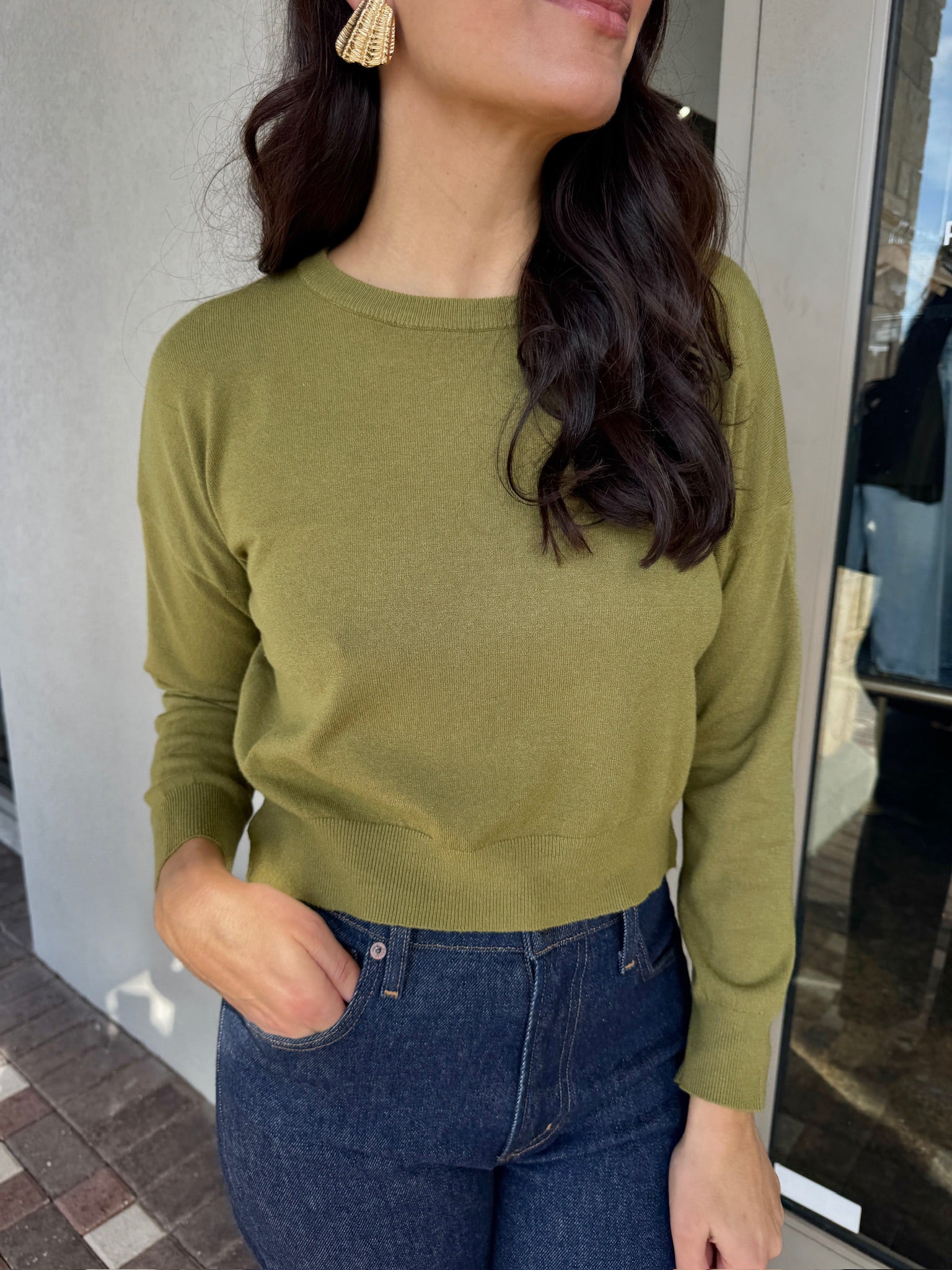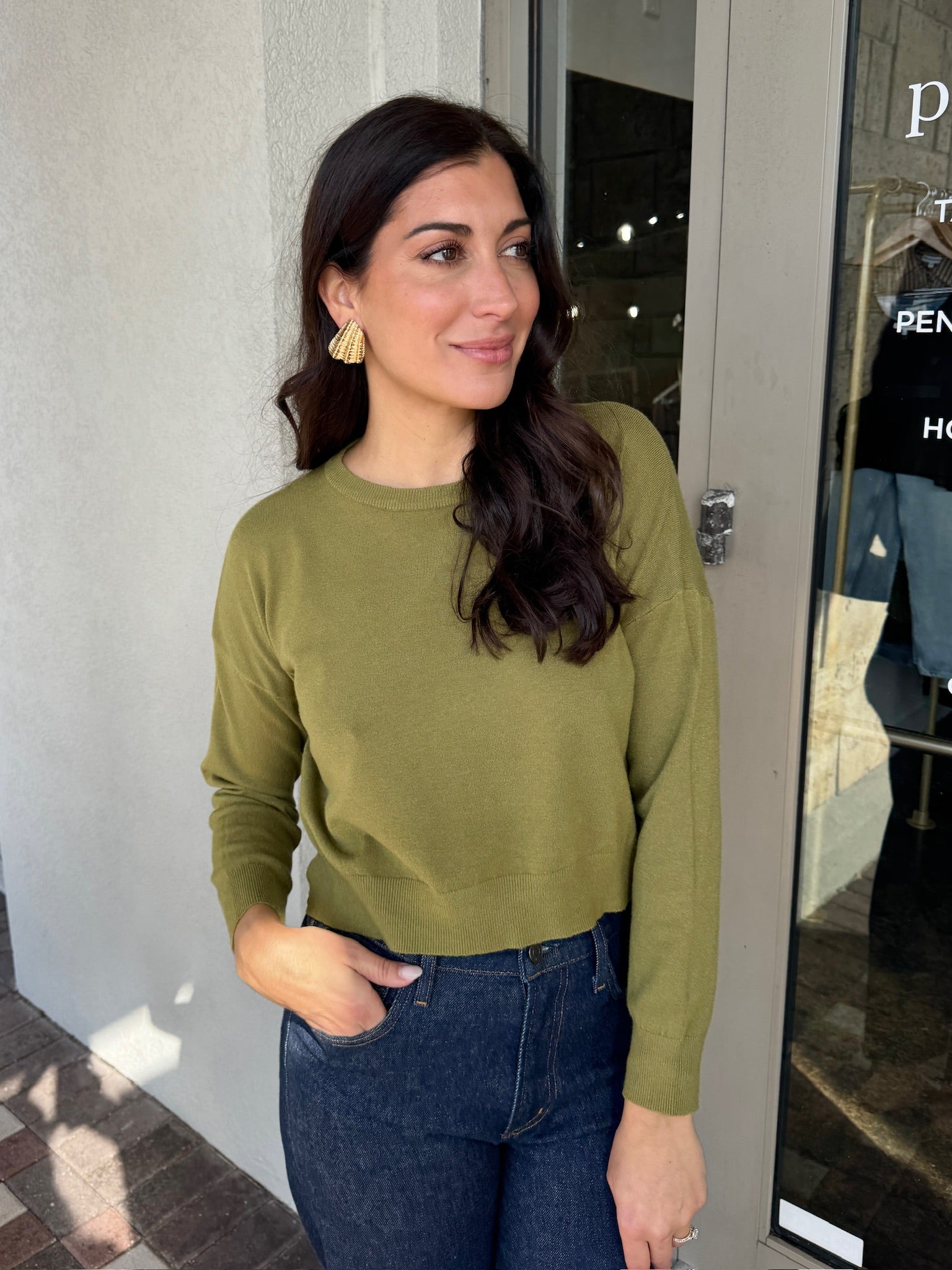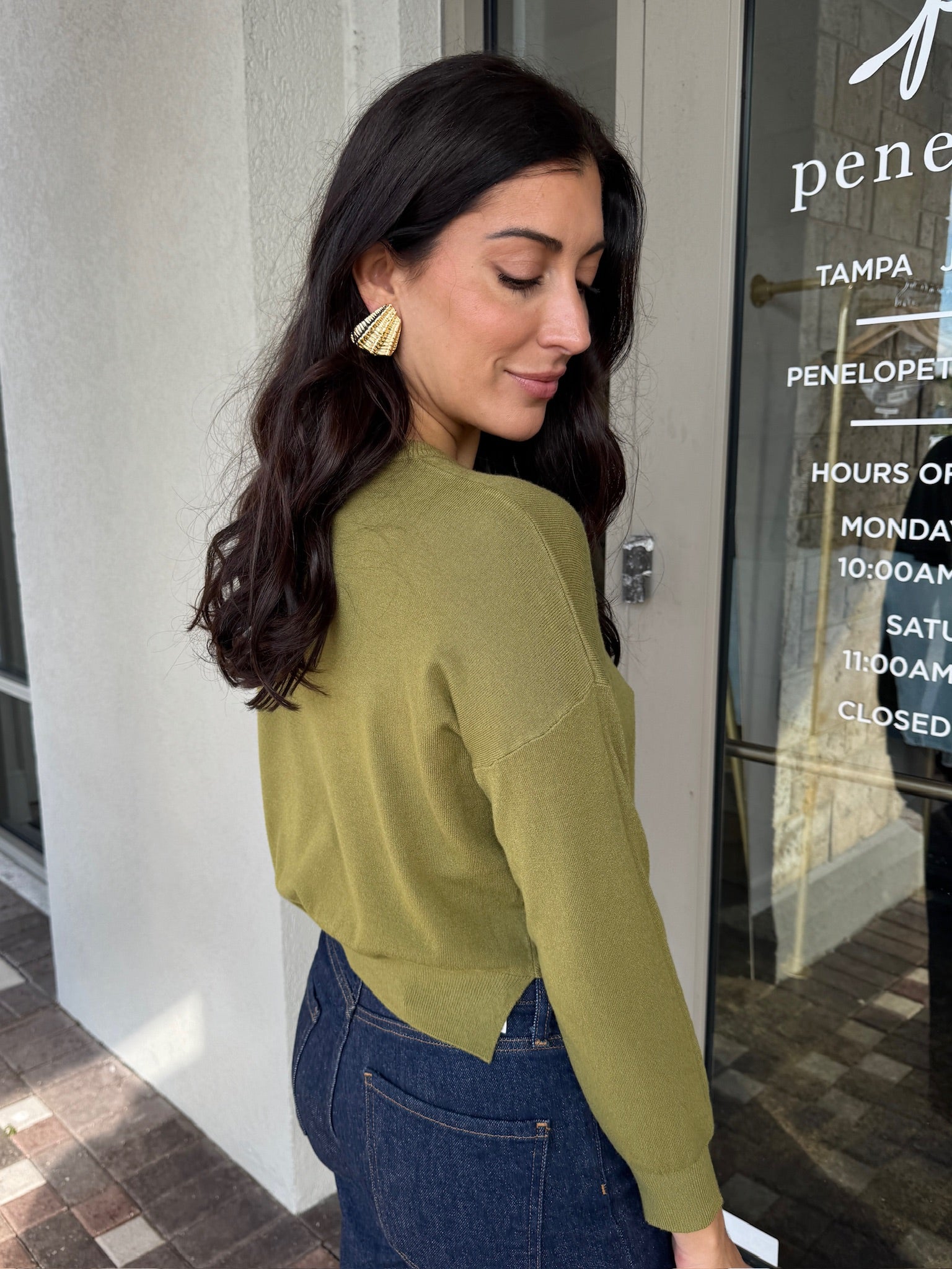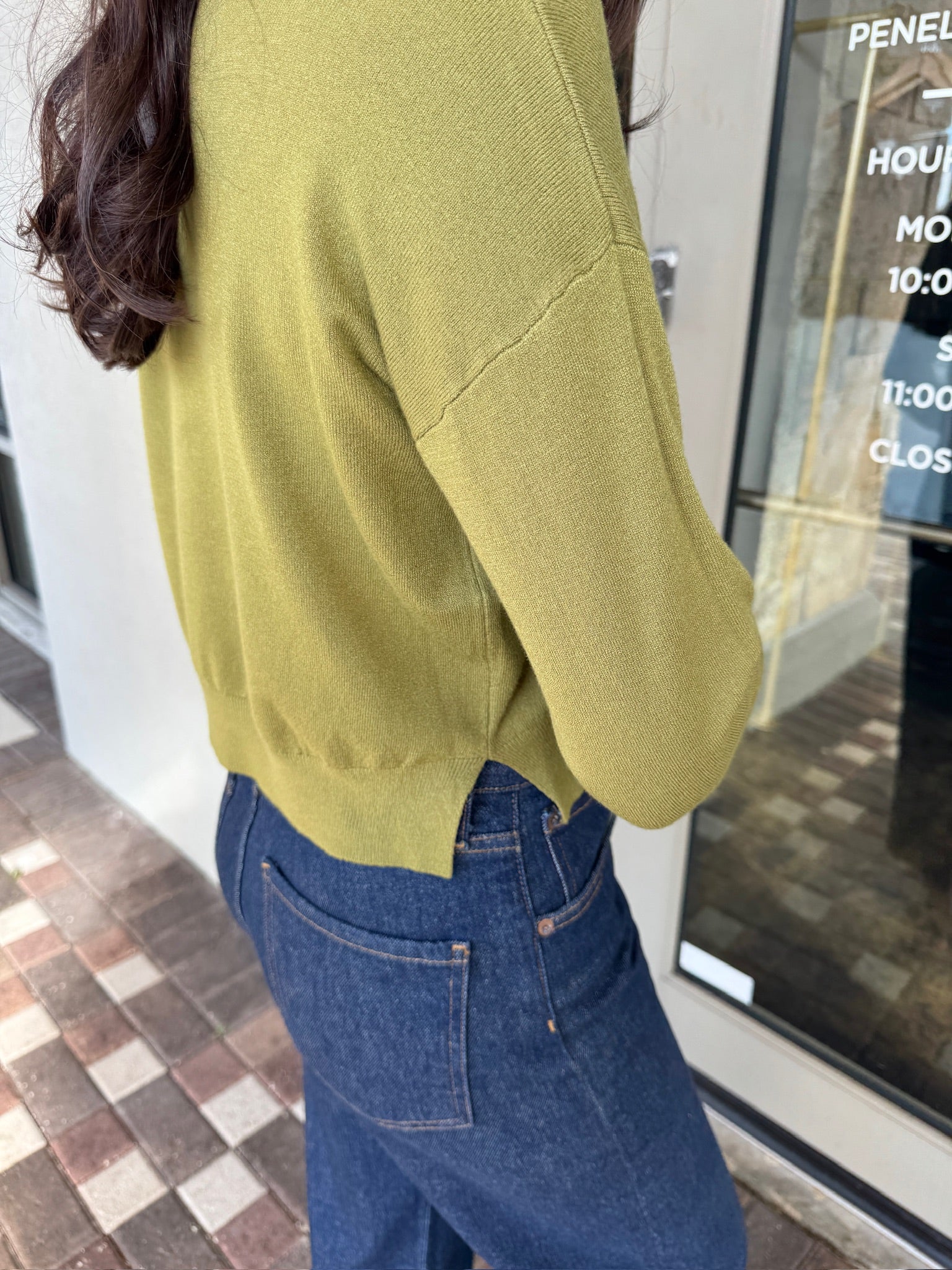 Woman wearing a beige cardigan and blue jeans standing outside a store.