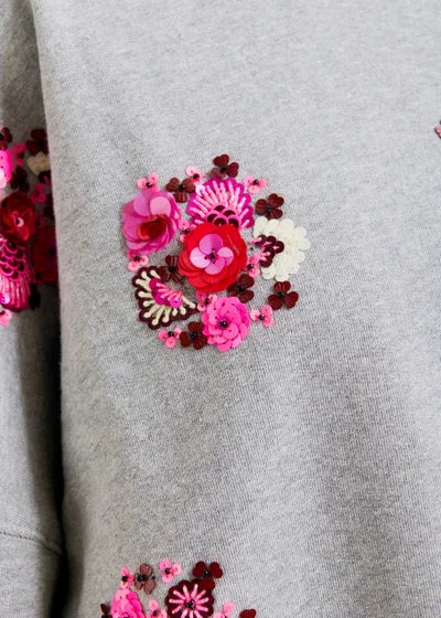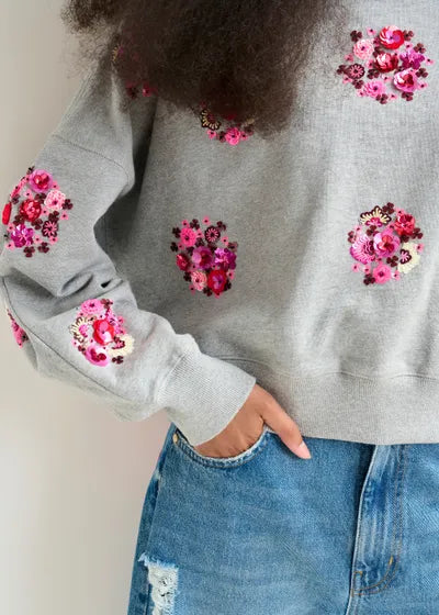 Woman wearing a brown jacket with floral embellishments against a gray background