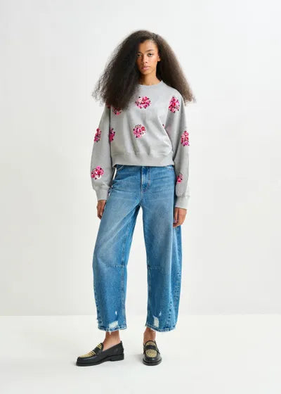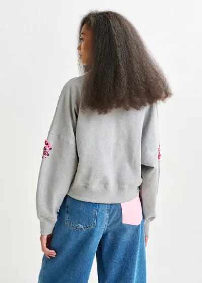 Woman wearing Kat Sweatshirt on a beige background