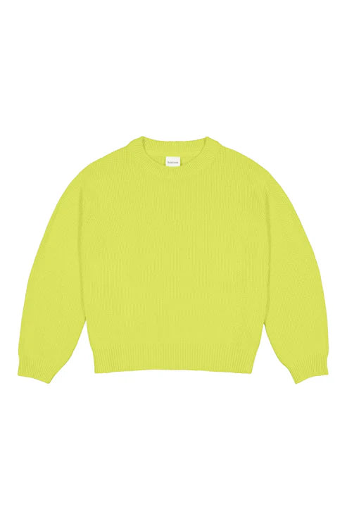 Person wearing a bright green sweater over a white shirt on a beige background